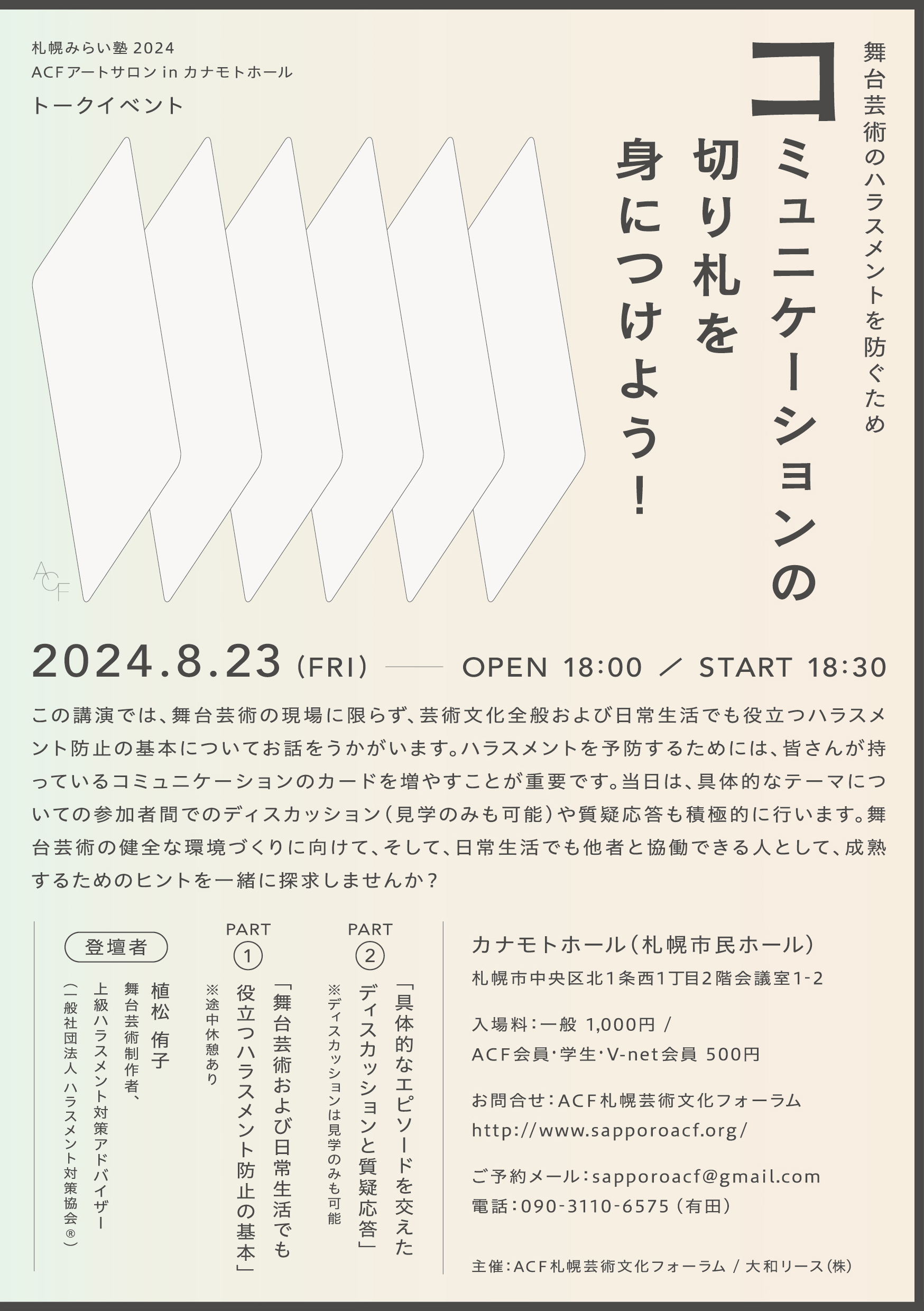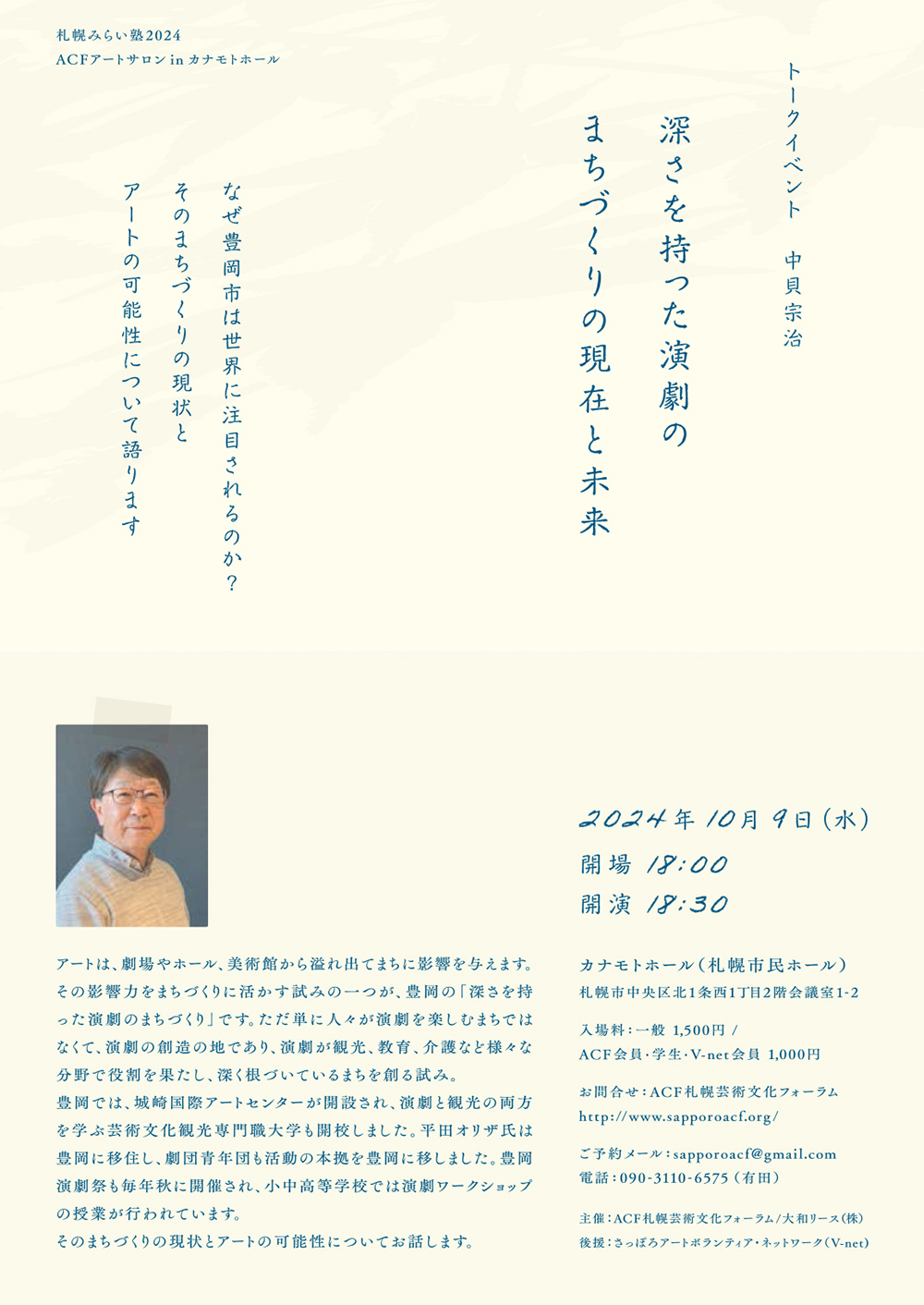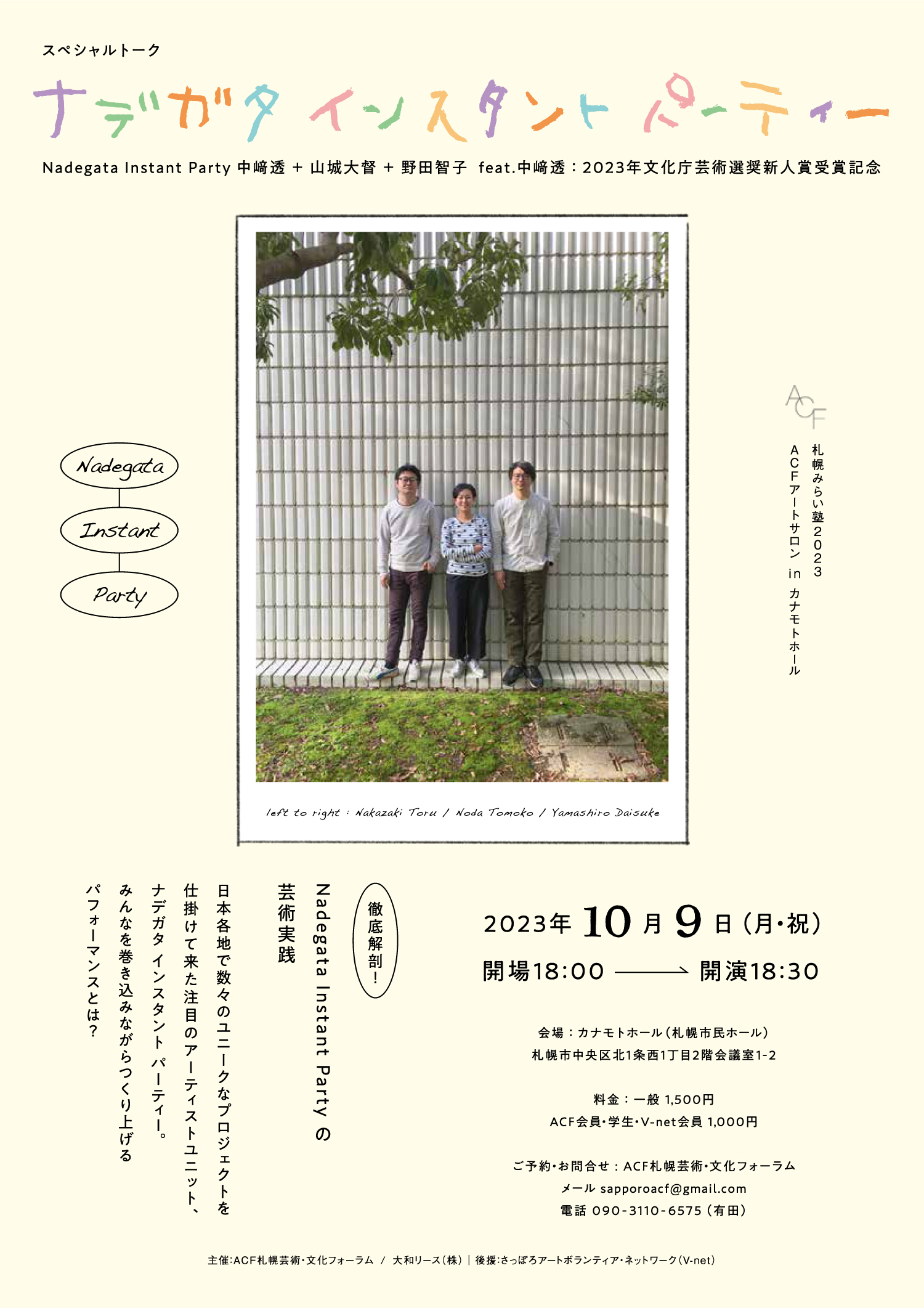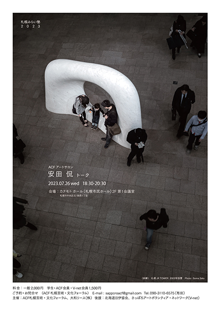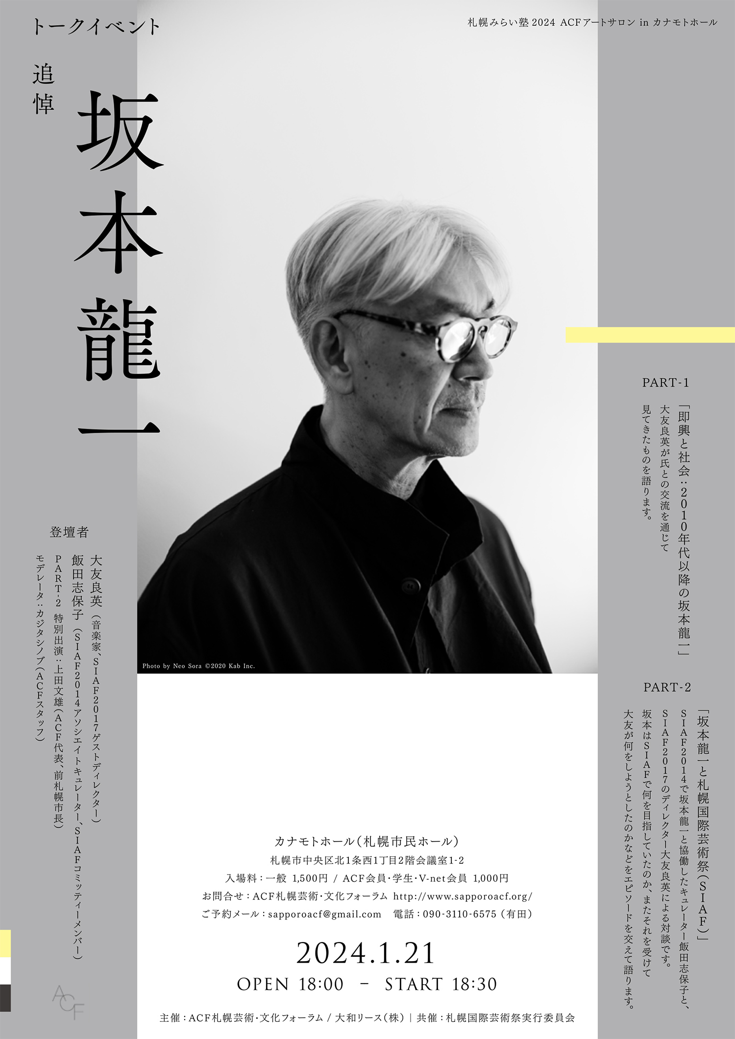 About 私たちは、創造都市札幌の未来を拓こうと、2007年春に市民有志が立ち上げた団体です。市民と芸術家そして行政、企業を結ぶネットワークを形成し、さまざまなイベントを実施し、情報を発信しています。市民の協働による芸術・文化の溢れるまち作りを目標としています。 ACFについて取り組み Events ACFフォーラムその他 イベントタイトル 開催日 予約受付中 ACFフォーラム 追悼 坂本龍一 2024年1月21日(日) イベント一覧 Topics 2025.03.04のこり作業 2025.02.28お知らせ 2025.02.28イベントトピックス 2025.02.21Hello world! トピックス一覧 Membership ACFの主旨に賛同いただければ、どなたでも入会いただけます。入会するとACFが企画する催しのご案内や、一部で割引きなどの特典があります。 会員募集